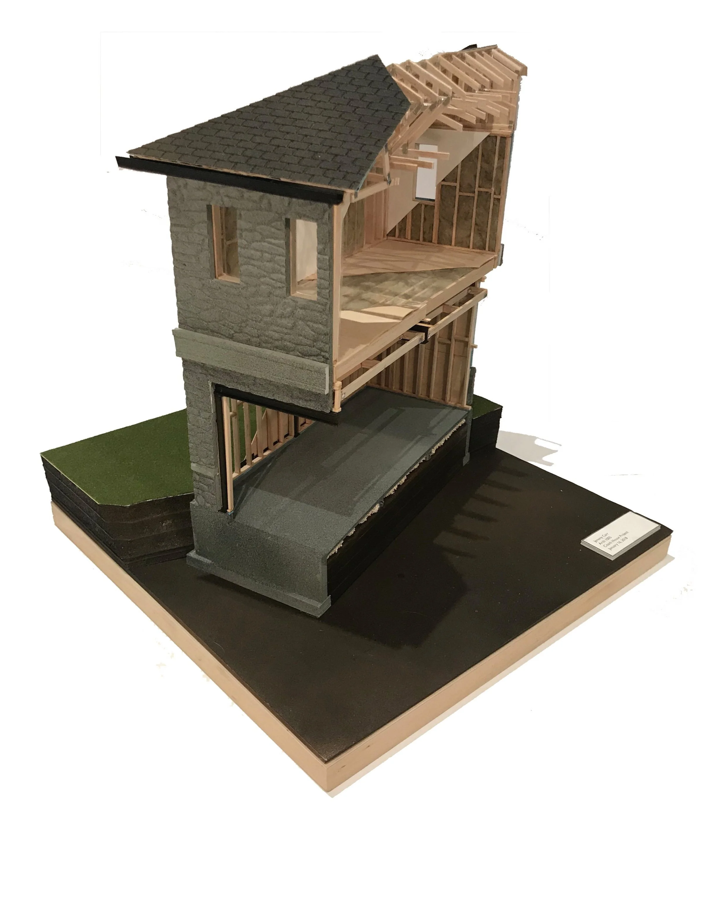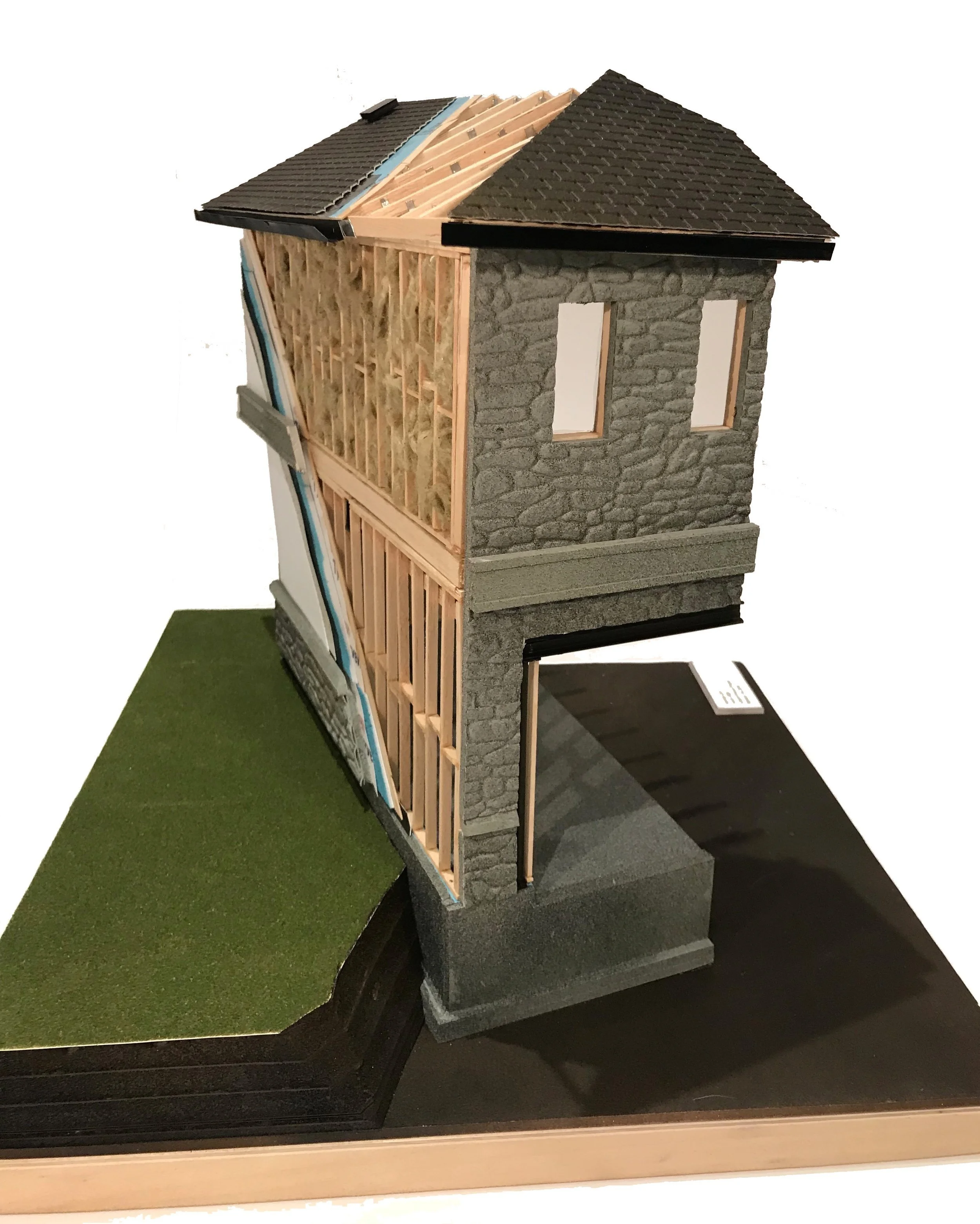 At the beginning of the six-semester Architectural Technology program, we explored and applied rudimentary building science concepts by practicing basic delineation and drafting skills as we prepared sketches. An extensive study of wood-frame and small-building construction was undertaken, working from footings up to roofs and including a comprehensive review of materials and connection conditions along the way. The hand drafting of each detail as we progressed upward from the foundation accompanied this analysis. At the end of the first semester, we were assigned to construct a physical 1:50 scale model of a portion of a supplied structure, implementing all of the knowledge we had acquired throughout the semester. Working from plans, sections and elevations, and using balsa wood, card stock and foam core, a Coach House model was fabricated down to the smallest detail at scale, as we concurrently produced, managed and archived the project documentation.